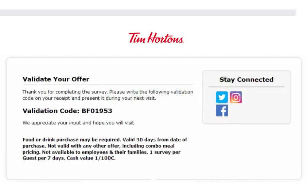 Once you finish, you’ll receive a validation code. Write it on your original receipt and bring it in on your next visit to get your Timbits deal.